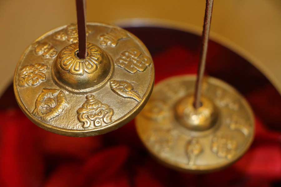 Tingsha bells are circular bell metal chimes connected by a leather string. They are often used to begin and end meditation practices to help focus the mind. They can be played to add depth to musical “soundscapes”. Tingshas are two cymbals connected by a leather string. When struck together, they create a pure high pitched sound which rings for a surprising length of time. We also use them to begin and end yoga sessions, massages and clearing space.