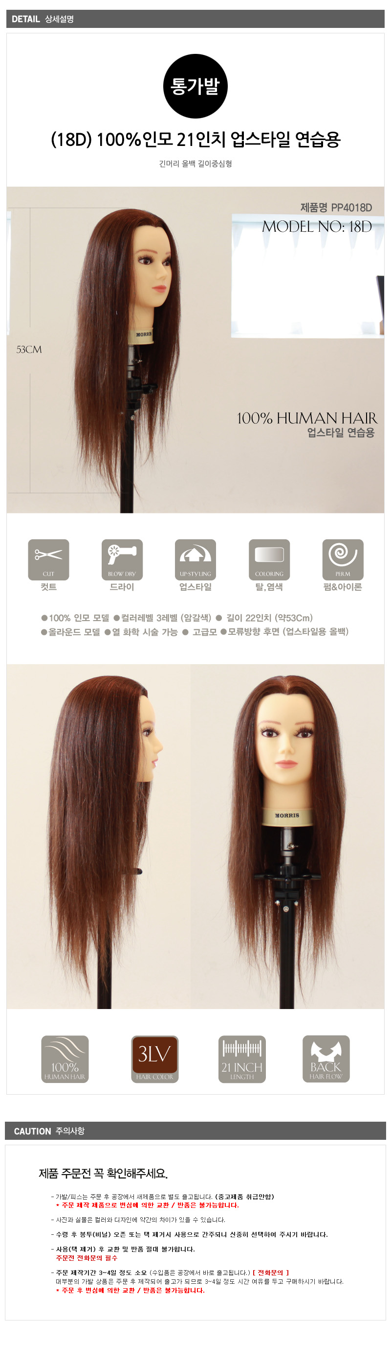 100%인모 통가발 21인치 업스타일 연습용 긴머리 올백 길이중심형